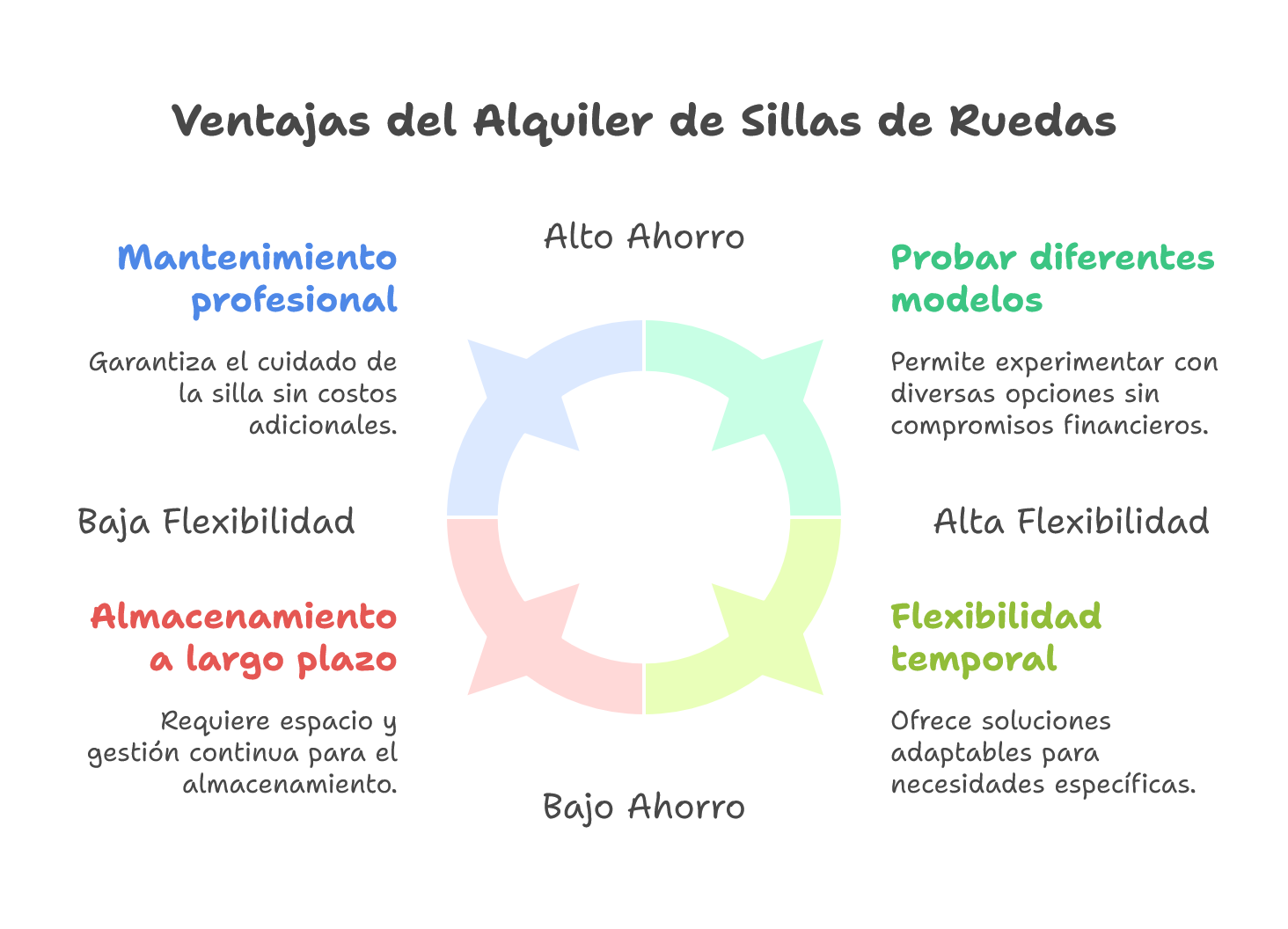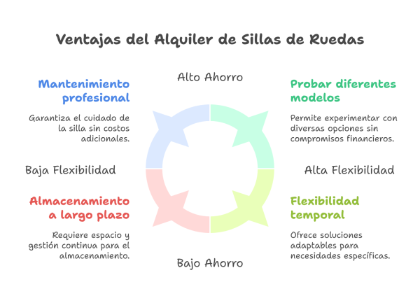 El alquiler de sillas de ruedas brinda muchas ventajas respecto la compra, sobre todo en el caso de usuarios temporales o visitantes, entre los cuales destacan la flexibilidad, el ahorro o la opción de poder probar diferentes modelos, dependiendo de las necesidades. Por otro lado, el alquiler elimina preocupaciones sobre las tareas del mantenimiento a largo plazo y el almacenamiento cuando ya no se necesita la silla, lo cual representa una opción muy útil para personas que precisan una solución de movilidad durante un periodo de tiempo muy limitado. La flexibilidad que permite esta alternativa significa que se puedan dar soluciones a situaciones particulares sin asumirse costes inconvenientes.